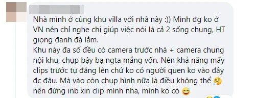 Một người khác thì cho biết mình ở chung khu villa với Sơn Tùng: "Mình đang không ở Việt Nam nên chỉ nghe chị giúp việc nói là cả hai sống chung, giọng Hải Tú đanh đá lắm. Khu này đa số đều có camera trước nhà và camera nội khu, chụp bậy người ta mắng. Nên khả năng mấy clip trước tự đăng lên chứ không có người quen nào vào đây được đâu. Mà vào còn chụp hình là điều không thể".