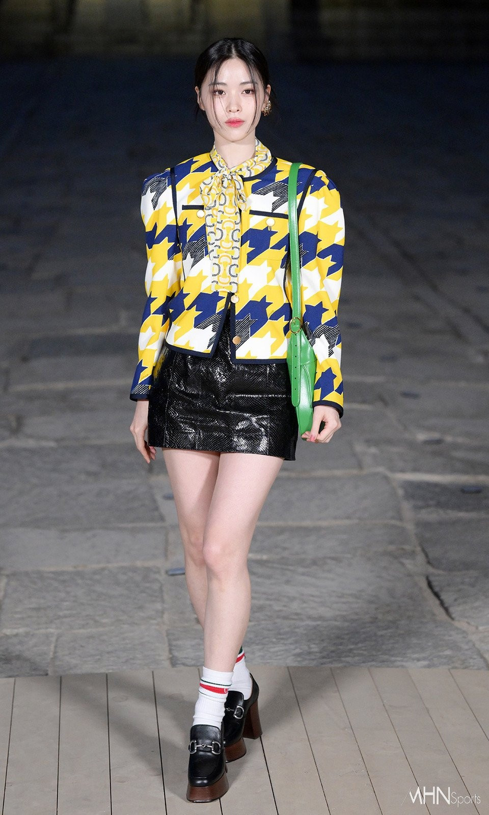 Nhận nhiều bình luận tích cực trên trang Twitter là bộ trang phục của Ryujin (ITZY). Nữ ca sĩ lựa chọn áo khóa có họa tiết nổi bật, kết hợp cùng khăn quàng cổ sặc sỡ và túi xách sắc xanh đơn giản. Nhằm trung hòa màu sắc phía trên, cô diện chân váy ngắn và giày da sắc đen có độ phản sáng tương tự. Lối trang điểm và làm tóc đơn giản là điểm cộng của thành viên nhóm nhạc ITZY. Ảnh: MHNSports.